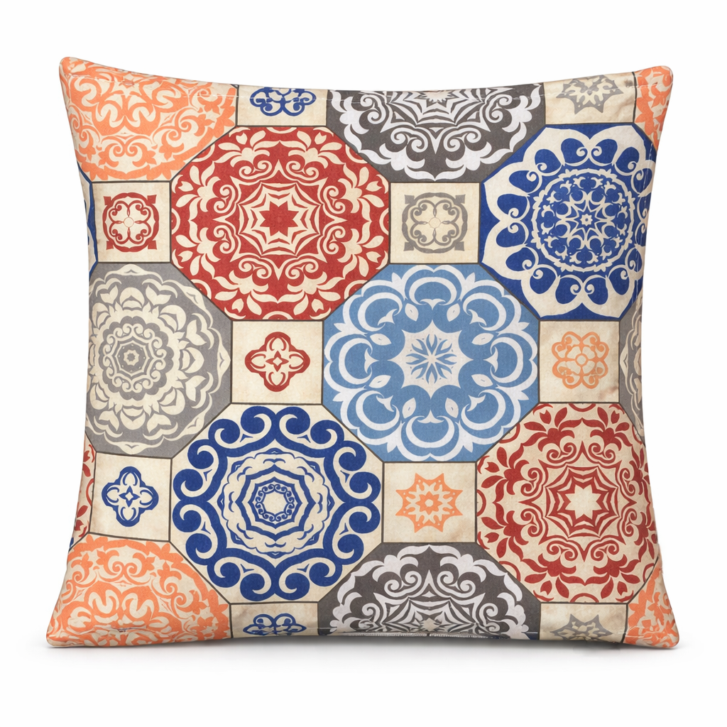 Δώστε ζωντάνια και χαρακτήρα στον χώρο σας με αυτό το εντυπωσιακό διακοσμητικό μαξιλάρι, εμπνευσμένο από μεσογειακές αποχρώσεις του μπλε, κόκκινου, γκρι και πορτοκαλί. Το γεωμετρικό του μοτίβο δημιουργεί ένα δυναμικό αλλά αρμονικό αποτέλεσμα που τραβά το βλέμμα και αναβαθμίζει κάθε γωνιά του σπιτιού.