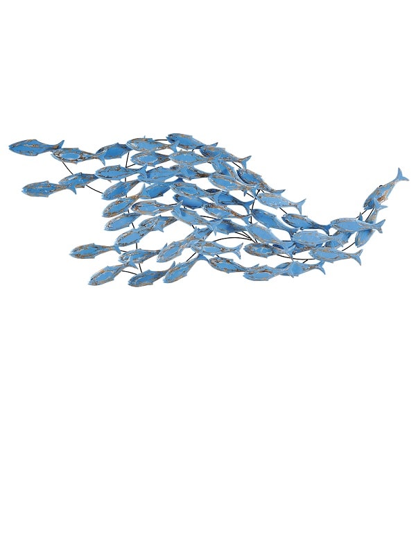 Wall decoration with wooden fish in a blue shade on a metal base.