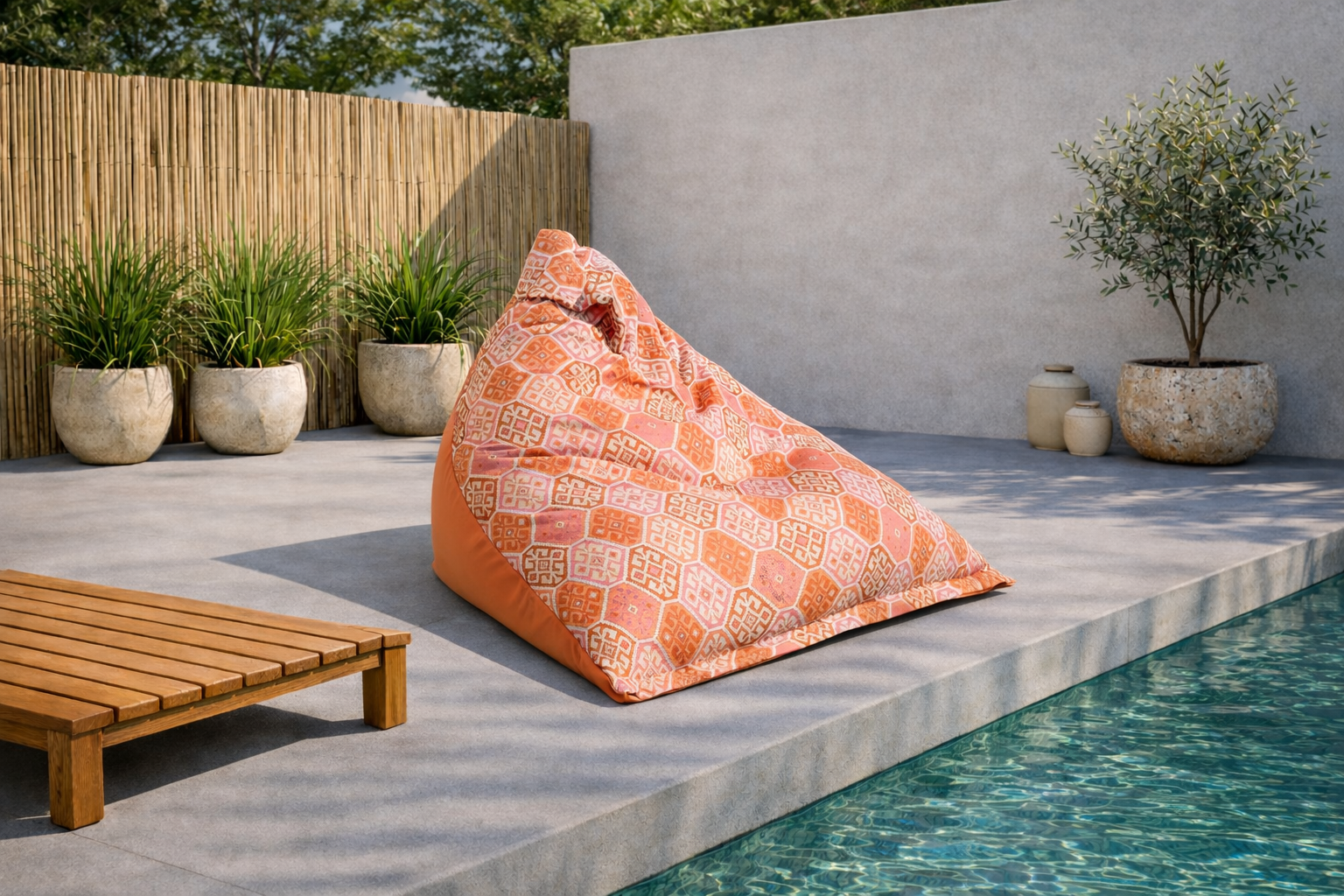 Πουφ πολυθρόνα δαπέδου Pyramis XL σε σχήμα πυραμίδας, με πορτοκαλί βάση και boho ύφασμα εξωτερικού χώρου Aladdin 05 Orange με μεγάλους ρόμβους σε πορτοκαλί & φούξια αποχρώσεις. Αφαιρούμενο κάλυμμα, πλύσιμο στους 30°C.