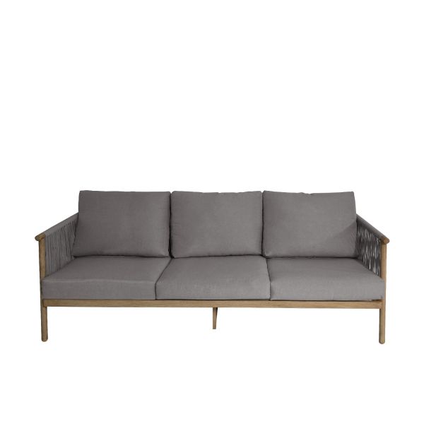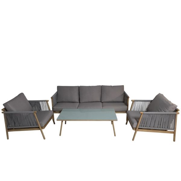Ο σκελετός αλουμινίου προσφέρει υψηλή αντοχή, σταθερότητα και προστασία από τη σκουριά, ενώ οι πλευρές με πλέξη σχοινιού (rope) προσδίδουν σύγχρονη αισθητική και ελαφριά αίσθηση στον σχεδιασμό. Τα άνετα μαξιλάρια καθίσματος και πλάτης προσφέρουν άνεση και στήριξη, καθιστώντας το σετ ιδανικό για καθημερινή χρήση.