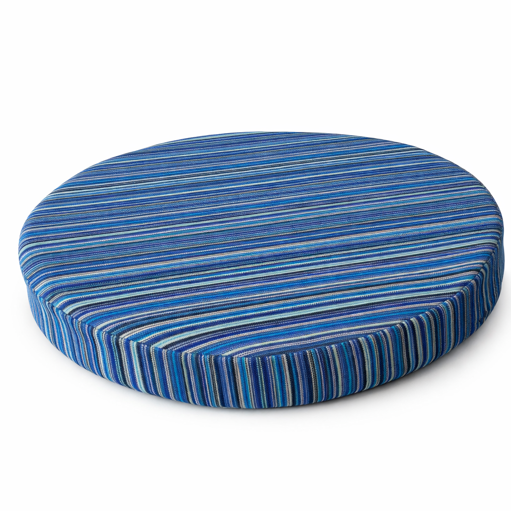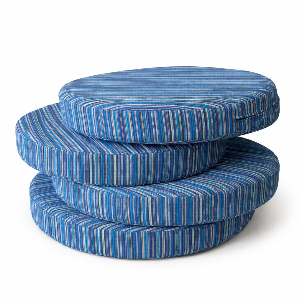 Σετ 4 στρογγυλά μαξιλάρια διαμέτρου 43εκ. και πάχους 6εκ., με ανθεκτικό ριγέ ύφασμα easy clean, αδιάβροχο και ανεξίτηλο. Κατάλληλα για εσωτερικούς και εξωτερικούς χώρους, πλένονται στους 30°C και προσφέρουν άνεση και σταθερή στήριξη. Εληνικής κατασκευής απο την εταιρία μας maxilaria.gr .