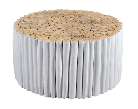 Το στρογγυλό τραπεζάκι σαλονιού από κορμούς μασίφ ξύλου Teak σε λευκή απόχρωση (white wash) αποτελεί ένα ιδιαίτερο διακοσμητικό στοιχείο με φυσικό χαρακτήρα. Ο σχεδιασμός του, που βασίζεται σε μικρούς κορμούς ξύλου, δημιουργεί μοναδική υφή και organic αισθητική, ιδανική για χώρους με boho, coastal ή rustic στυλ.