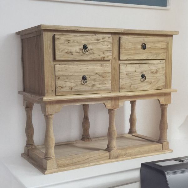 Η μασίφ ξύλινη κονσόλα σε ανοιχτή φυσική απόχρωση συνδυάζει την πρακτικότητα με την αυθεντική ομορφιά του φυσικού ξύλου. Διαθέτει τέσσερα άνετα συρτάρια και μια ανοιχτή κάτω βάση, ιδανική για επιπλέον αποθήκευση ή διακοσμητικά. Τα γυριστά της πόδια προσδίδουν έναν παραδοσιακό χαρακτήρα, ενώ η ανοιχτόχρωμη απόχρωση αναδεικνύει τη φωτεινότητα του χώρου.