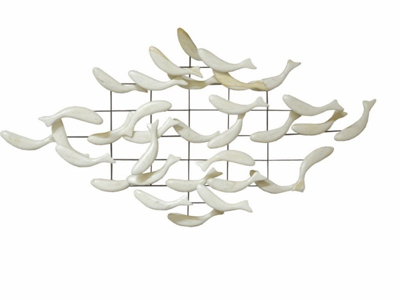 Διακοσμητικό τοίχου ξύλινα ψαράκια σε λευκή απόχρωση πάνω σε μεταλλικό πλέγμα.
